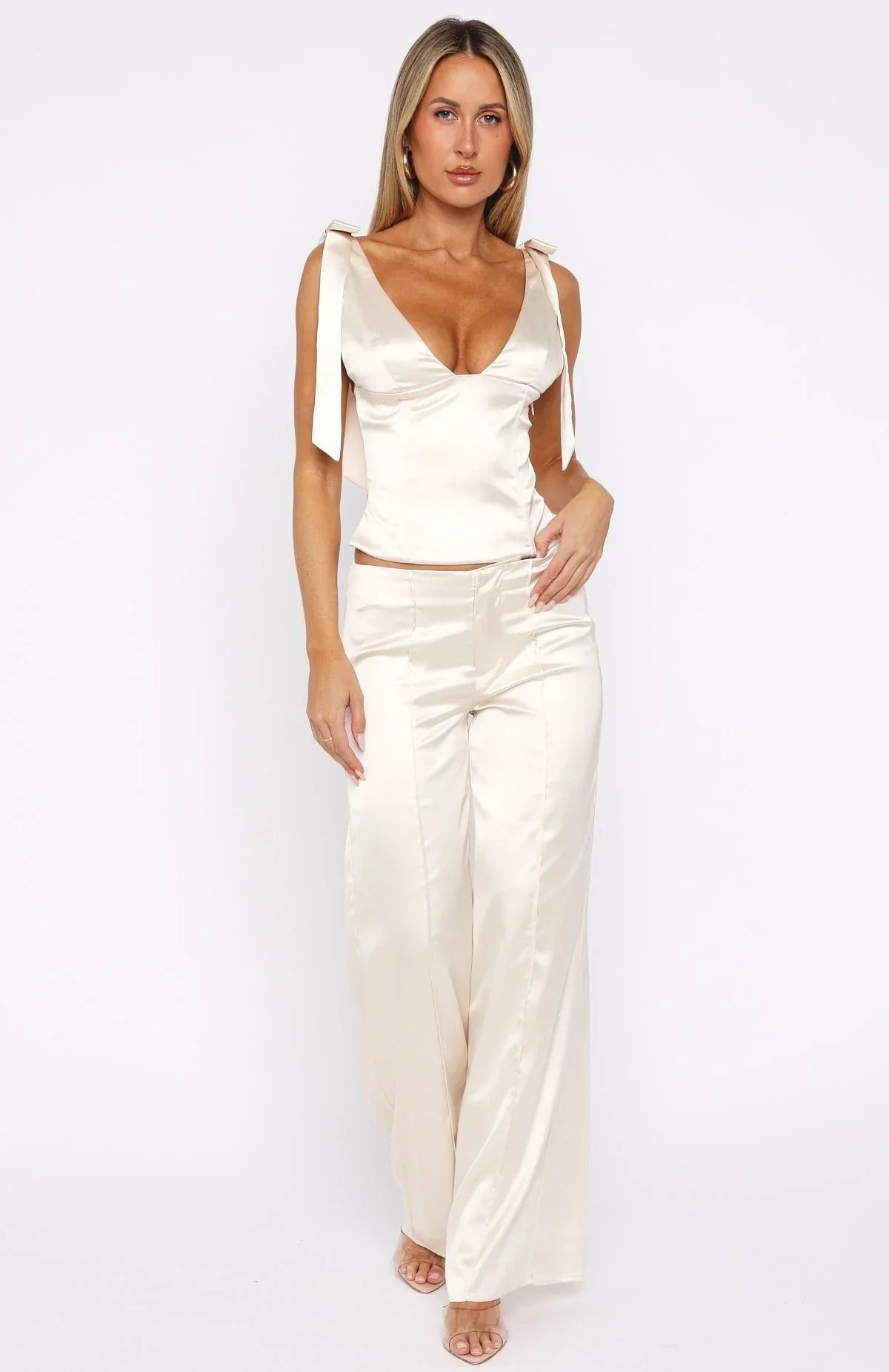 Holiday elegance in motion. The Keep It Lit Top Pearl elevates your festive wardrobe with its silky fabric, bow‑tied thick shoulder straps, a plunging V‑neckline, and a sculpted fitted bodice supported by internal boning. Fully lined and finished with a side zipper plus hook‑and‑eye closure for a flawless finish. Style it with the matching Keep It Lit Pants Pearl and statement heels for an effortless, ultra‑chic holiday look.